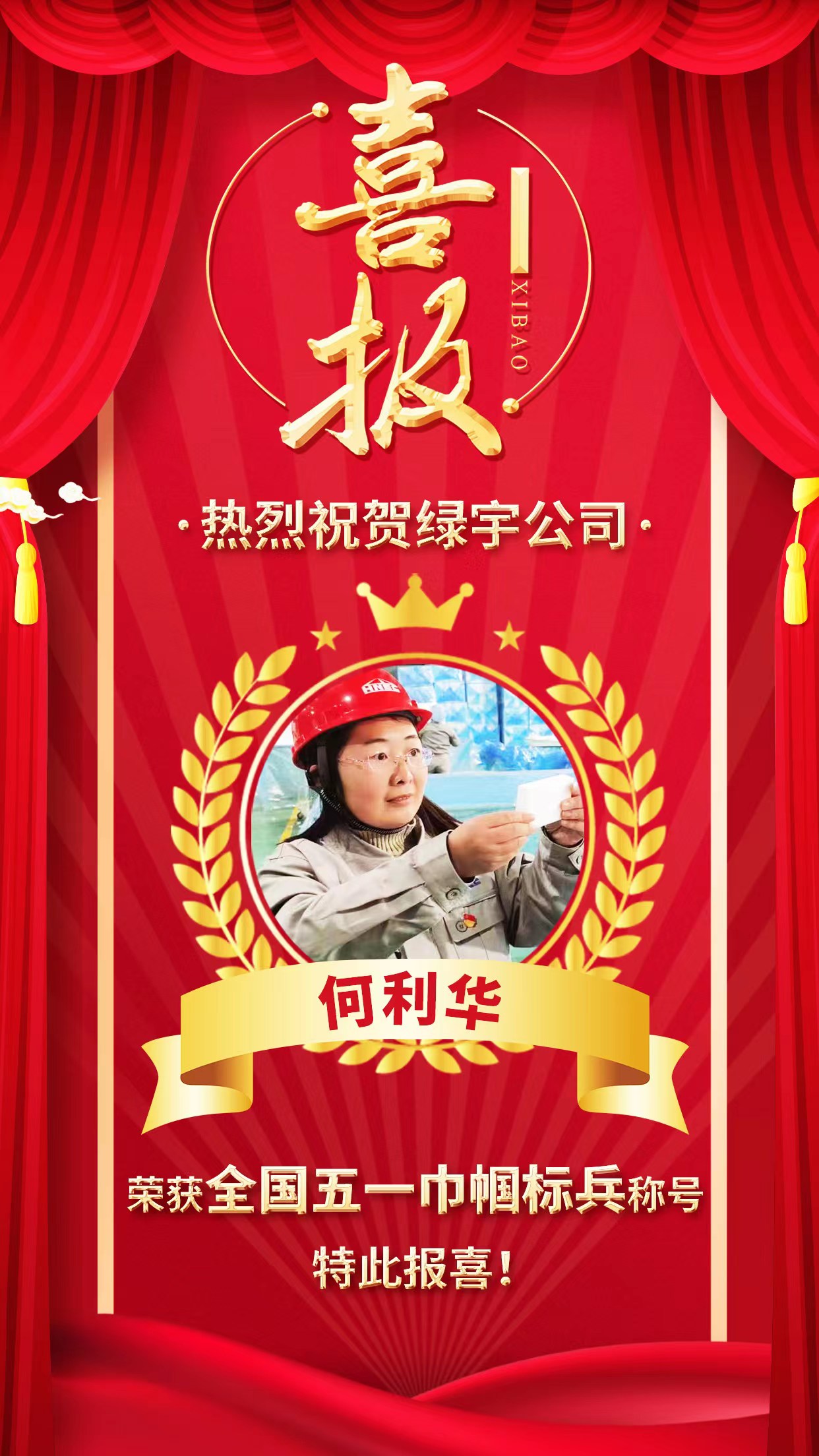 喜報!熱烈祝賀綠宇公司何利華榮獲“全國五一巾幗標(biāo)兵”稱號